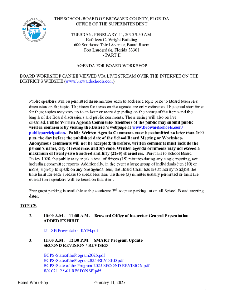 Document outlines the agenda for the School Board Workshop of Broward County, detailing the schedule of presentations and topics to be discussed, including public participation instructions and policies