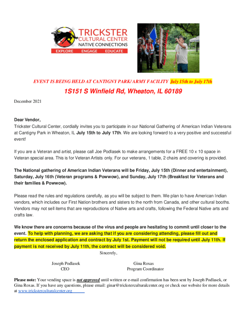 This document is an invitation for vendors to participate in the National Gathering of American Indian Veterans at Cantigny Park, detailing registration details, rules, and guidelines for participation.