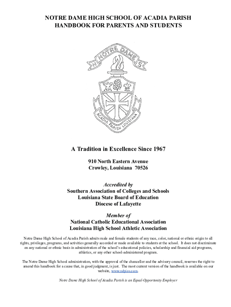Get the free Notre Dame High School of Acadia Parish Handbook for Parents and Students