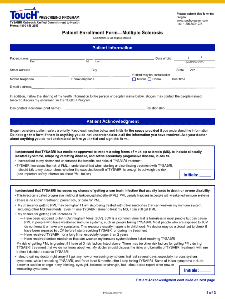 Email, fax, or share your tysabri enrollment form form via URL. You can also download, print, or export forms to your preferred cloud storage service.