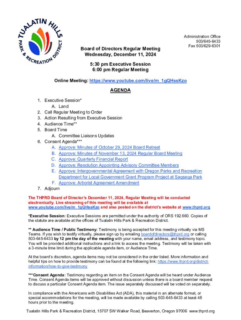 Get the free Tualatin Hills Park & Recreation District Board Meeting Documentation