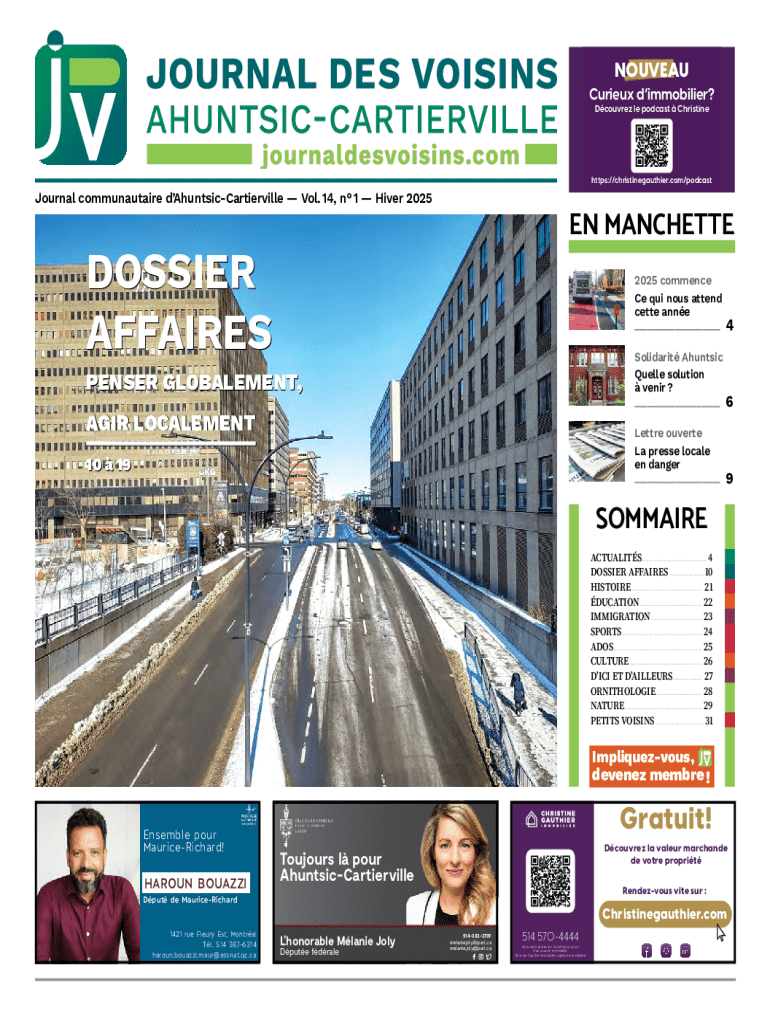Ce document est le journal communautaire d\'Ahuntsic-Cartierville qui aborde divers sujets tels que l\'immobilier, l\'éducation, la culture, le sport et les nouvelles locales, tout en présentant