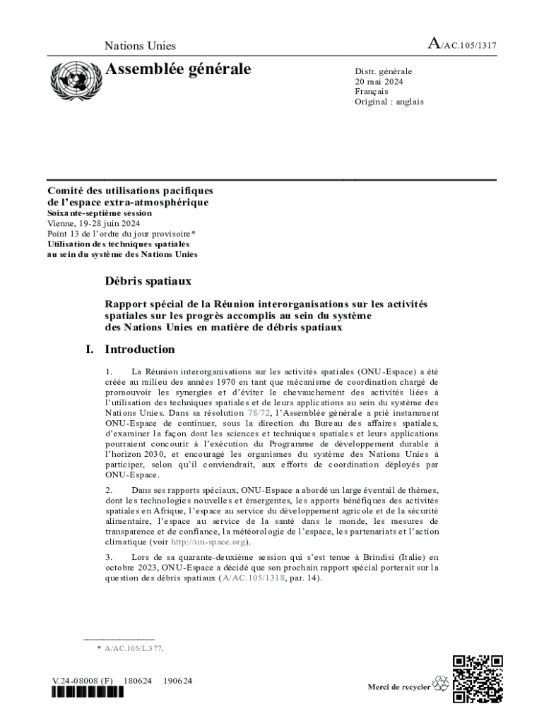 Rapport spécial sur les progrès réalisés concernant les débris spatiaux au sein du système des Nations Unies, abordant la gestion et la réduction des débris spatiaux en lien avec les activités