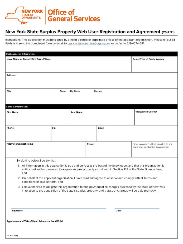 Get the free New York State Surplus Property Web User Registration and Agreement (cs-217.1) - ogs ny