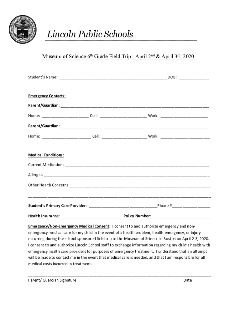 Get the free Lincoln Public Schools Museum of Science Field Trip Consent