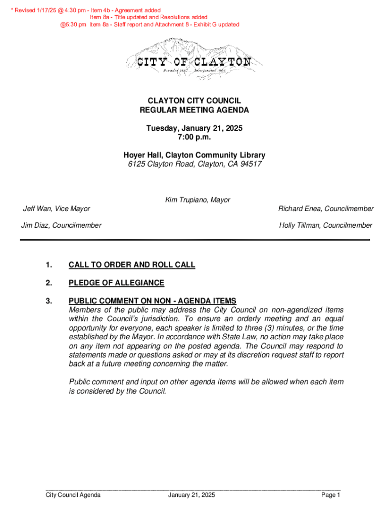 This document is the agenda for the Clayton City Council regular meeting scheduled for January 21, 2025. It outlines the schedule, items for discussion, public comment periods, resolutions, and actions