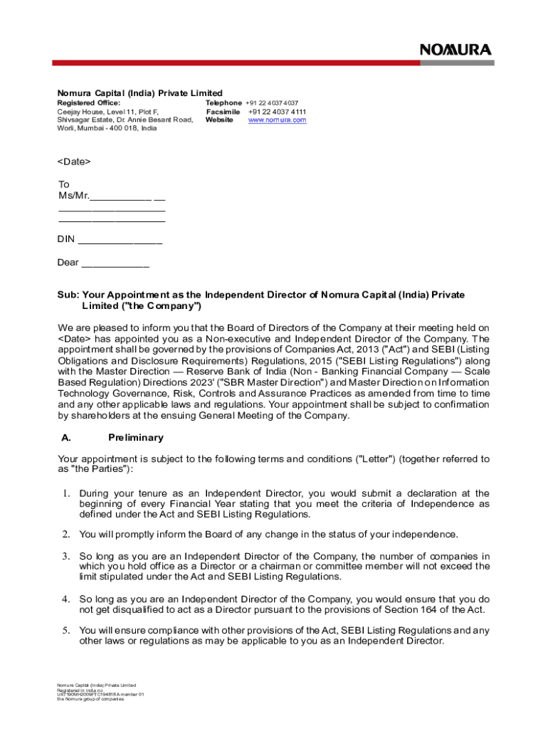 Get the free Nomura Capital Independent Director Appointment Letter
