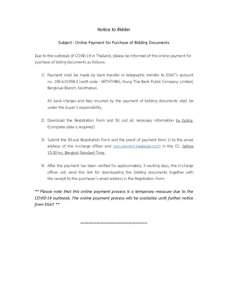 This document informs bidders about the online payment process for purchasing bidding documents due to COVID-19, detailing payment methods, submission instructions, and additional information regarding