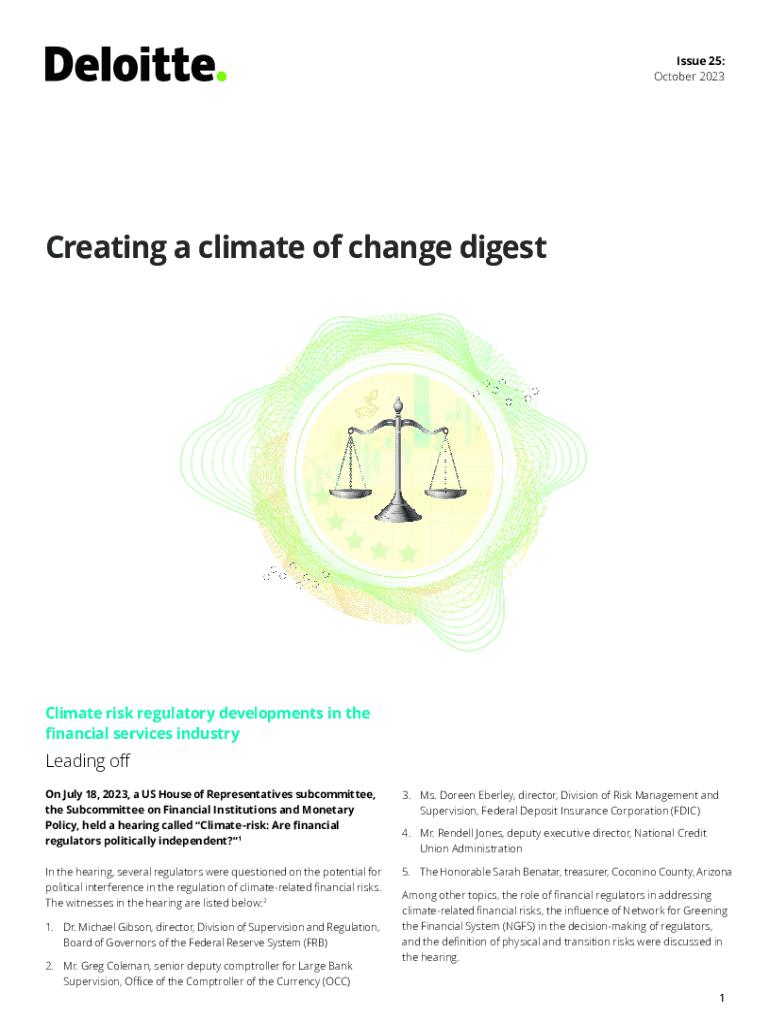 The document discusses recent regulatory developments concerning climate-related financial risks in the financial services industry, including discussions from various hearings, endorsements of sustainability