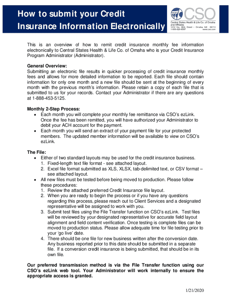 This document provides an overview of the process for submitting credit insurance monthly fee information electronically to Central States Health & Life Co. of Omaha, including the required formats