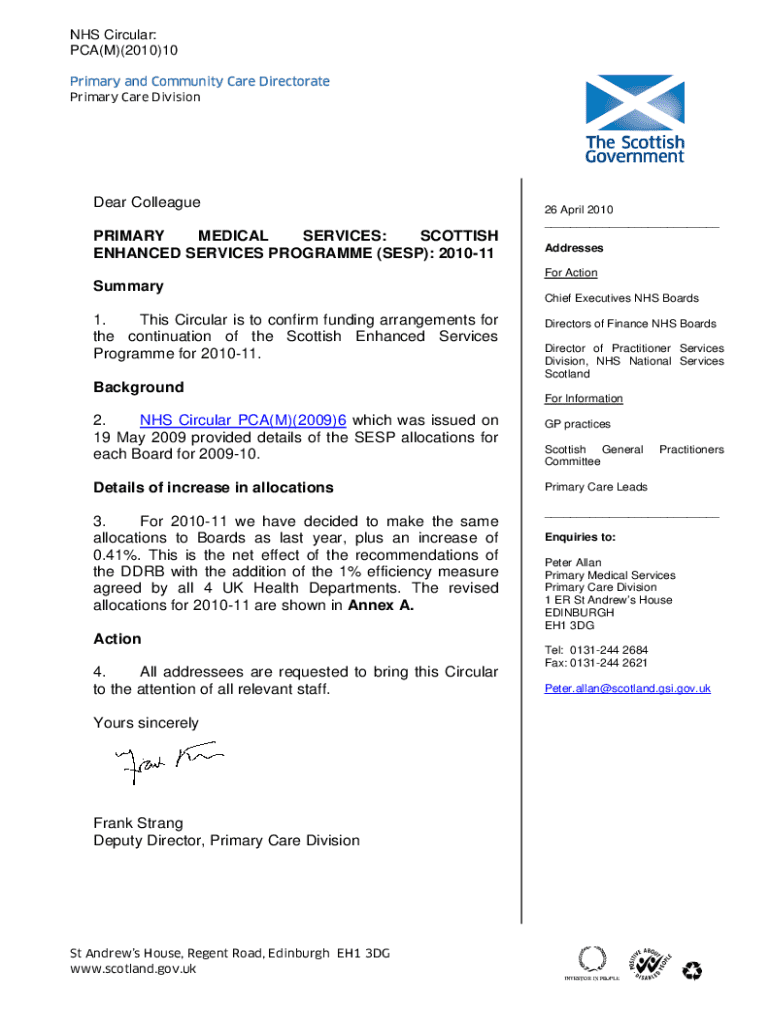 This Circular confirms the funding arrangements for the continuation of the Scottish Enhanced Services Programme for the year 2010-11, detailing the allocations to various NHS Boards and an increase