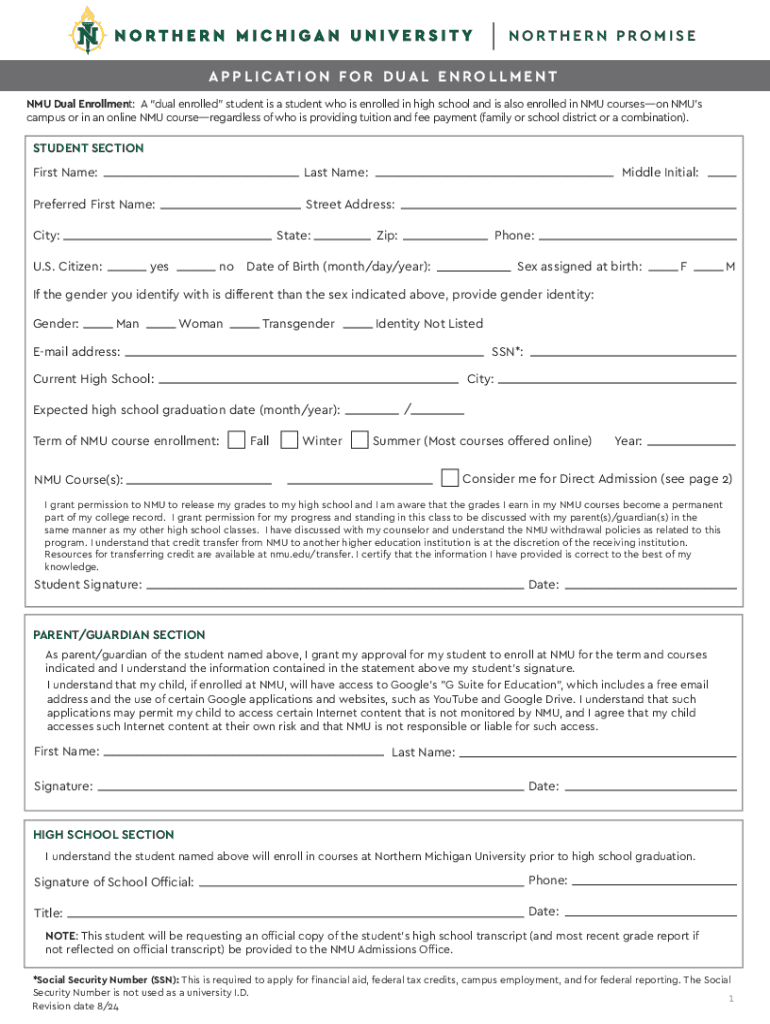 This document serves as an application for students seeking to dual enroll at Northern Michigan University (NMU), allowing high school students to take NMU courses while still enrolled in high school.