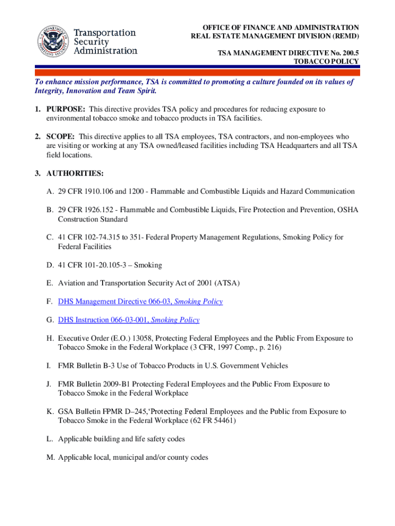 This directive provides TSA policy and procedures for reducing exposure to environmental tobacco smoke and tobacco products in TSA facilities.