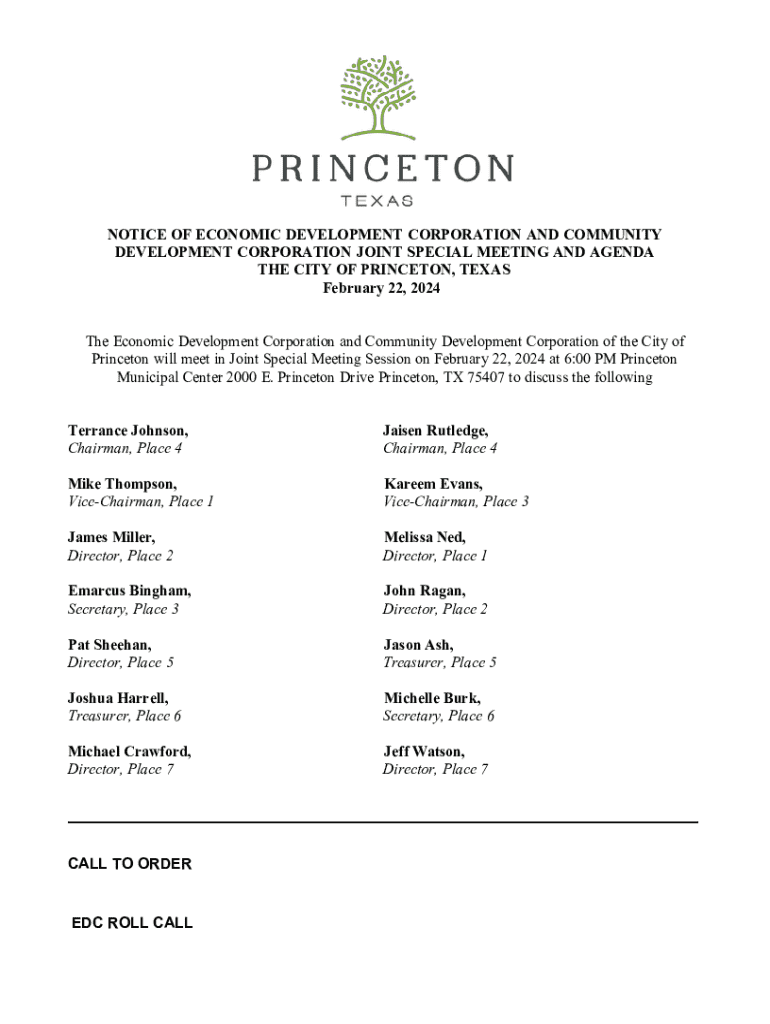 This document serves as a notice for the Joint Special Meeting of the Economic Development Corporation and Community Development Corporation of Princeton, Texas, detailing the meeting agenda and official