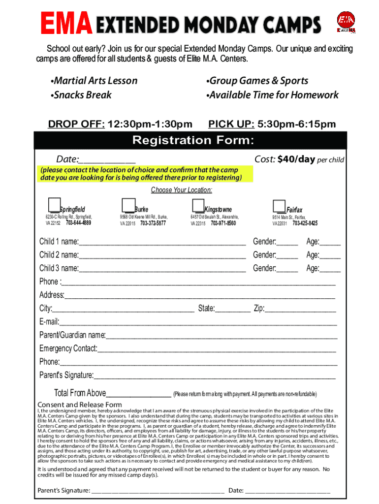 EMA Extended Monday Camps serve as a valuable resource for participants seeking an engaging and enriching experience. These camps are designed to provide children with educational and recreational activities beyond the traditional school week, specifically on Mondays. The format allows for extended learning opportunities, making it essential to have a streamlined process for enrolling participants.
