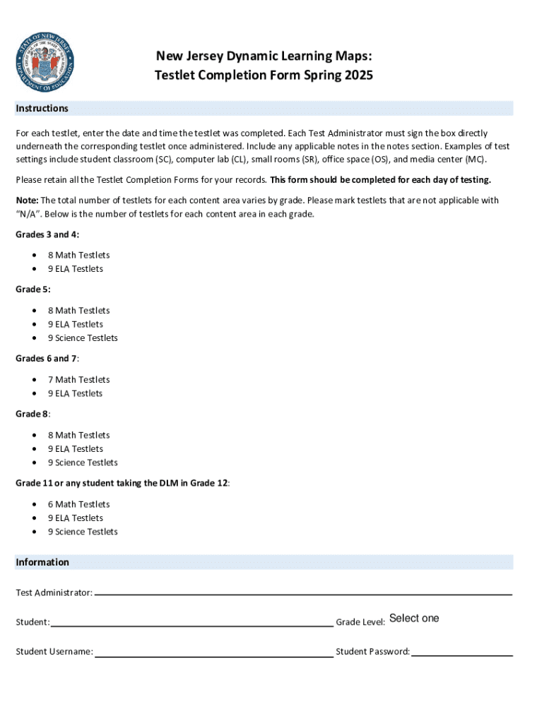 Get the free New Jersey Dynamic Learning Maps: Testlet Completion Form Spring 2025