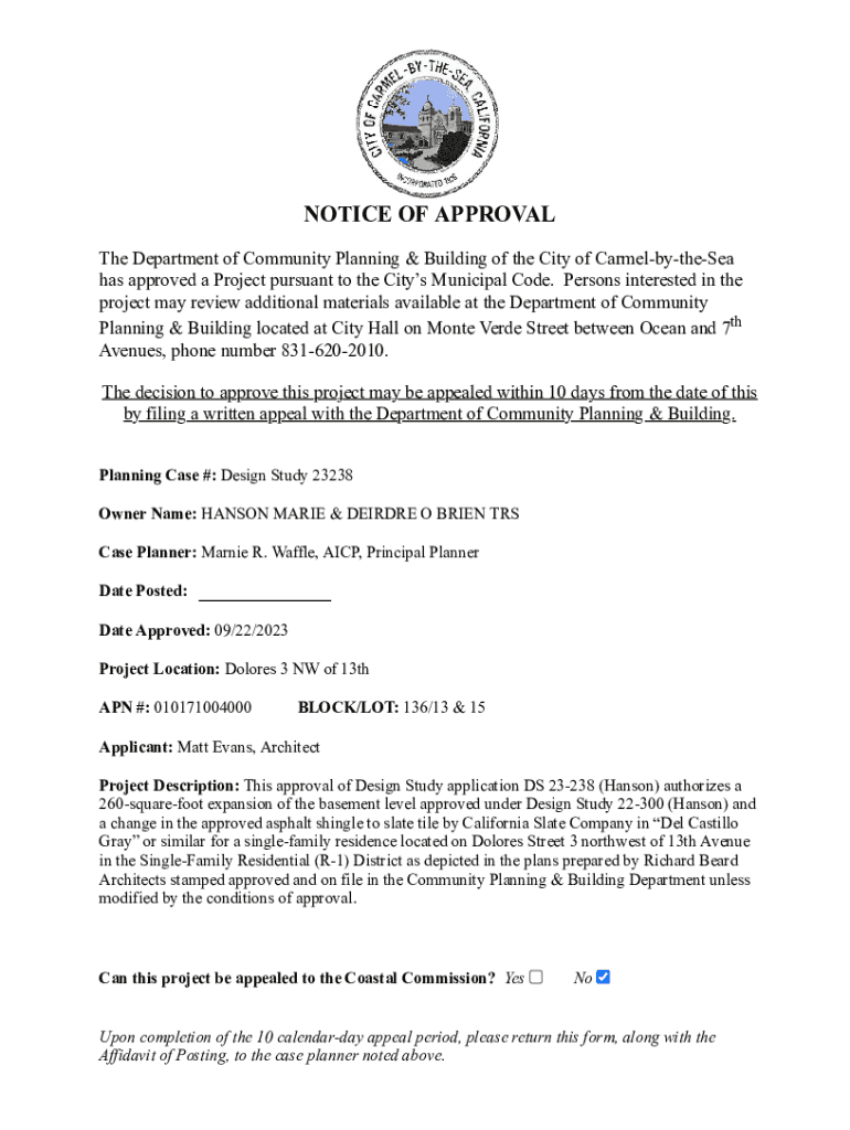 This document notifies the approval of a project for a single-family residence expansion and changes in materials as per the Design Study application. It includes conditions for compliance and appeal