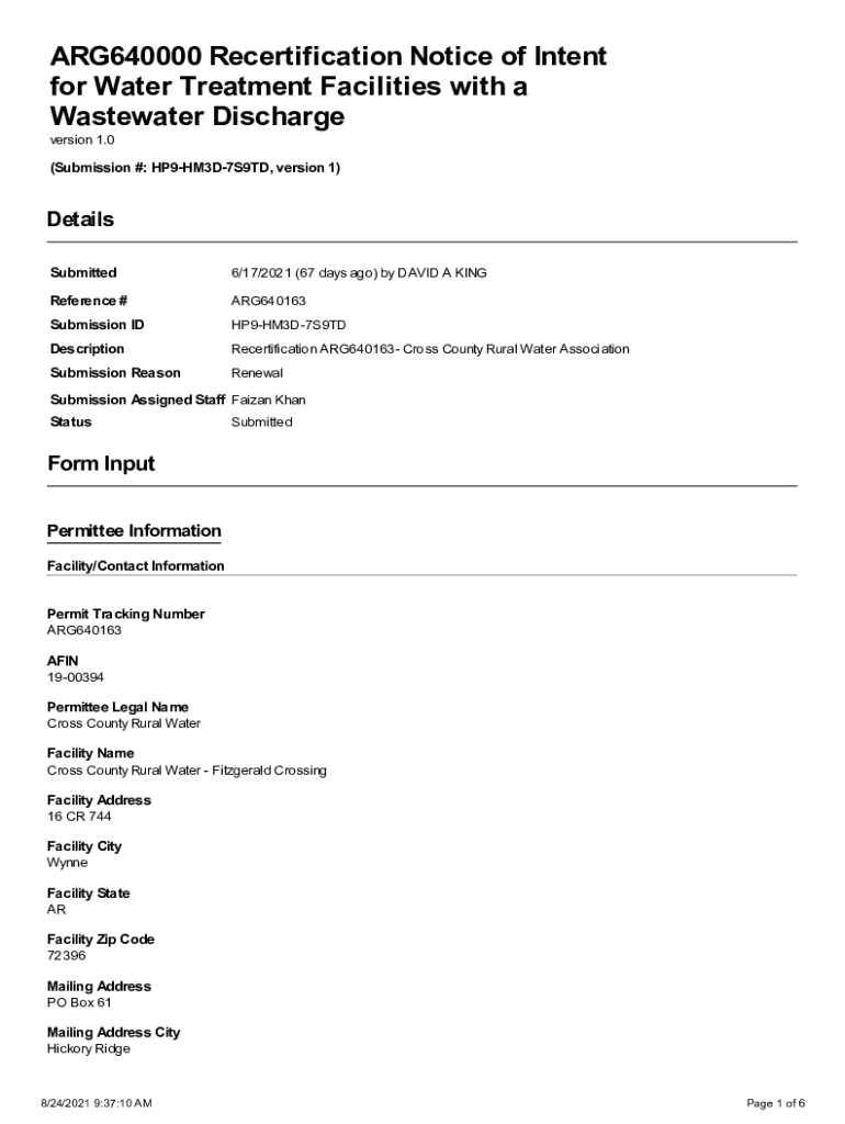 This document serves as a recertification notice for the Cross County Rural Water Association regarding its water treatment facilities and wastewater discharge, detailing permittee and facility information,