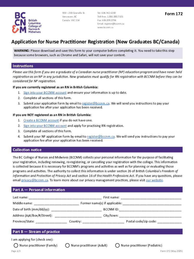 This document serves as an application form for nurse practitioner registration for new graduates from Canadian nurse practitioner education programs who have never held registration as an NP in any