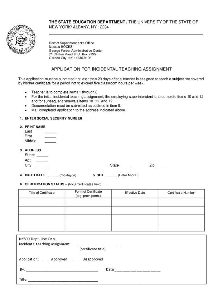 Get the free Application for Incidental Teaching Assignment