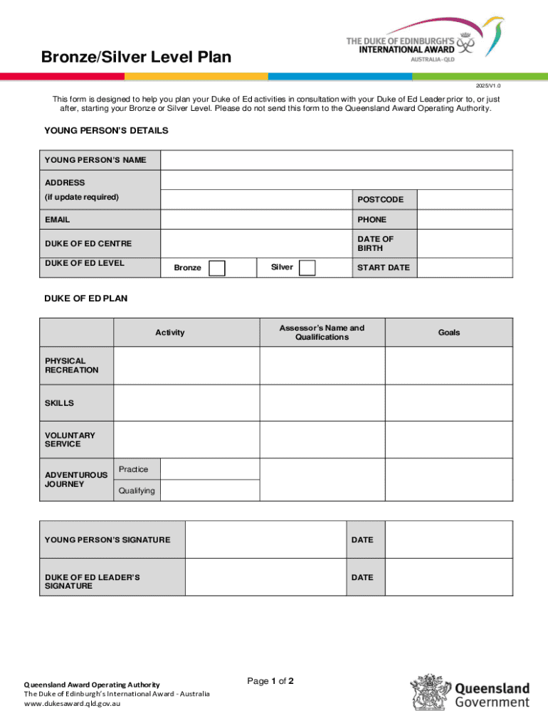 This form is designed to help plan Duke of Ed activities for Bronze or Silver Level in consultation with a Duke of Ed Leader.