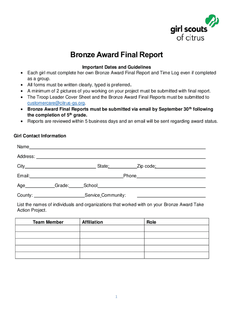 The Bronze Award Final Report is a pivotal component in the process for achieving one of the Girl Scouts' notable awards. This report encapsulates the efforts and achievements of the award applicant and their troop during the project undertaken to earn the Bronze Award. Serving as a formal documentation of their work, this report outlines various aspects of their project journey from inception to completion.
