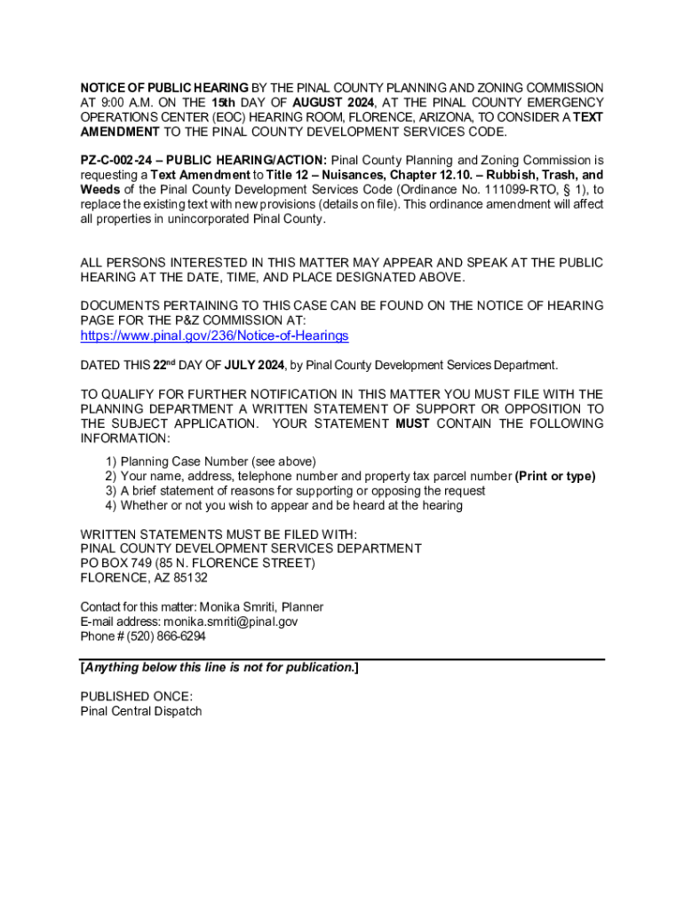 This document announces a public hearing regarding a proposed text amendment to the Pinal County Development Services Code, specifically to update provisions related to nuisances such as rubbish,