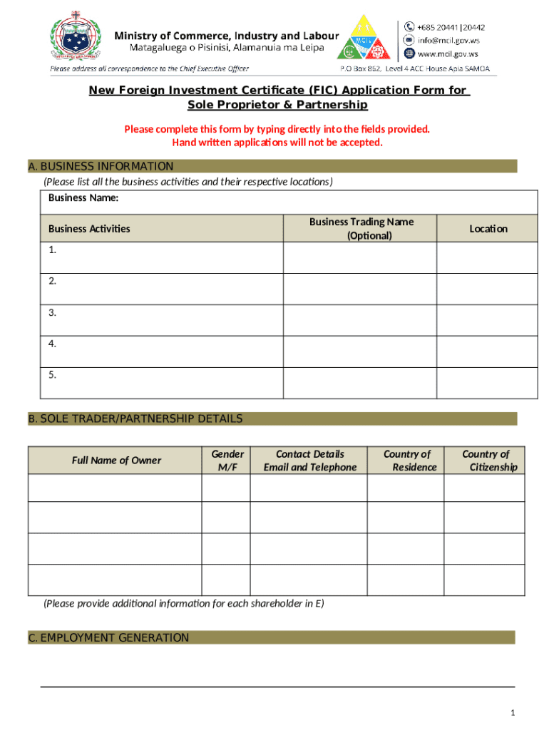 Instructions for the New Foreign Investment Certificate (fic) Application for Sole Proprietor & Partnership form