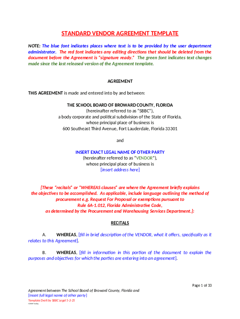 Utilizing a standard vendor agreement template streamlines the contract creation process significantly. Instead of drafting contracts from scratch for each new vendor, businesses can rely on a comprehensive template that addresses all necessary details. This not only saves time but also allows for quicker engagements with vendors, thereby operational efficiency.