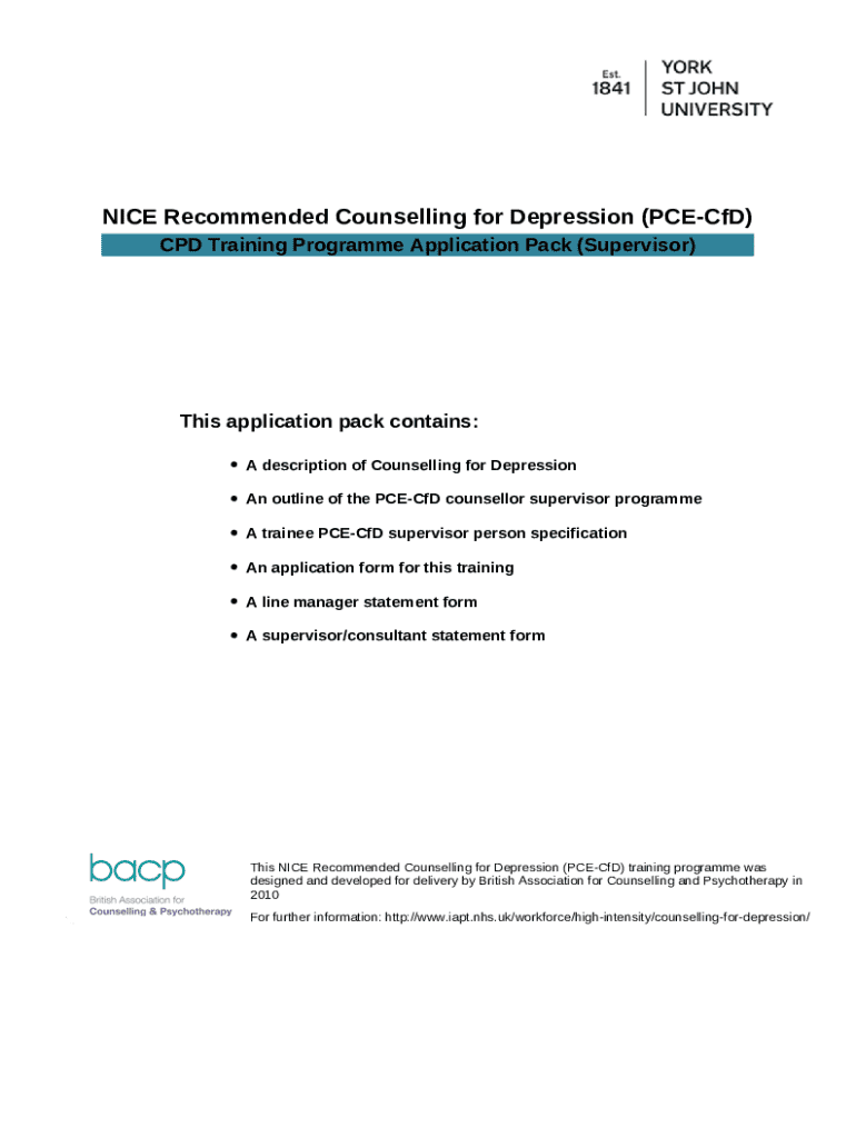 Nice Recommended Counselling for Depression (pce-cfd) Cpd Training Programme Application Pack (supervisor) template instructions