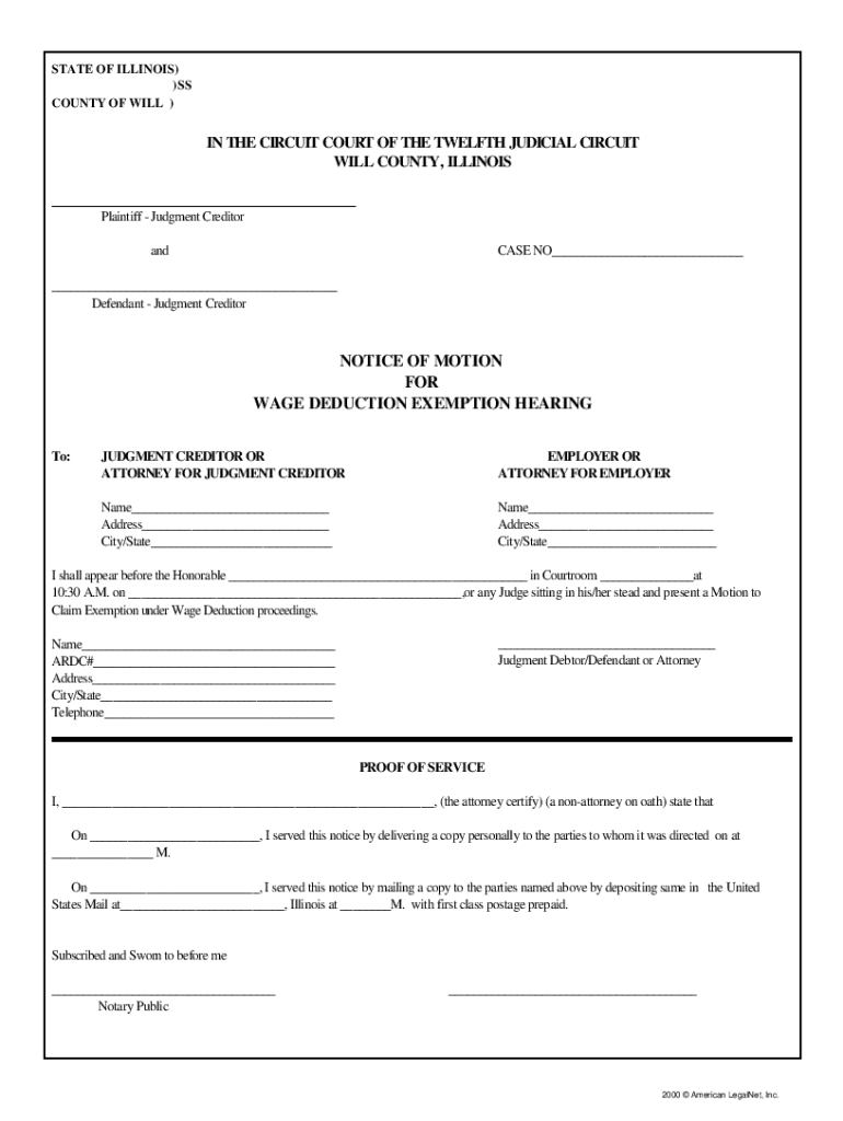 Get the free Notice of Motion for Wage Deduction Exemption Hearing