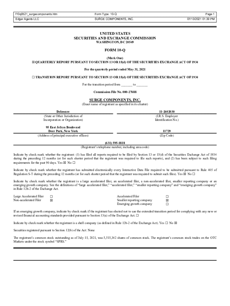 Quarterly report pursuant to Section 13 or 15(d) of the Securities Exchange Act of 1934 for Surge Components, Inc. for the quarterly period ended May 31, 2021, detailing the company\'s financial statements