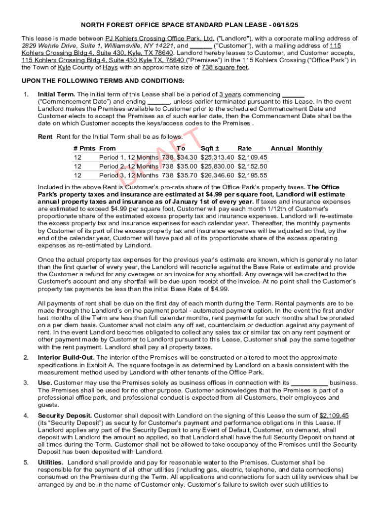 This document is a lease agreement between PJ Kohlers Crossing Office Park, Ltd. and a customer for office space rental, outlining terms, conditions, rent structure, and responsibilities.