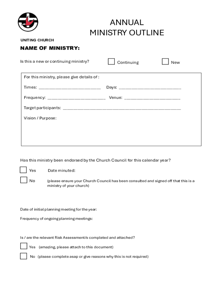 An Annual Ministry Outline Form is a roadmap for ministries to articulate their objectives, events, and budgeting for the year. This systematic approach allows ministries to visualize their purpose and effectiveness through structured planning. The necessity of yearly planning cannot be overstated, as it creates a clear path for the congregation's action, development, and outreach.