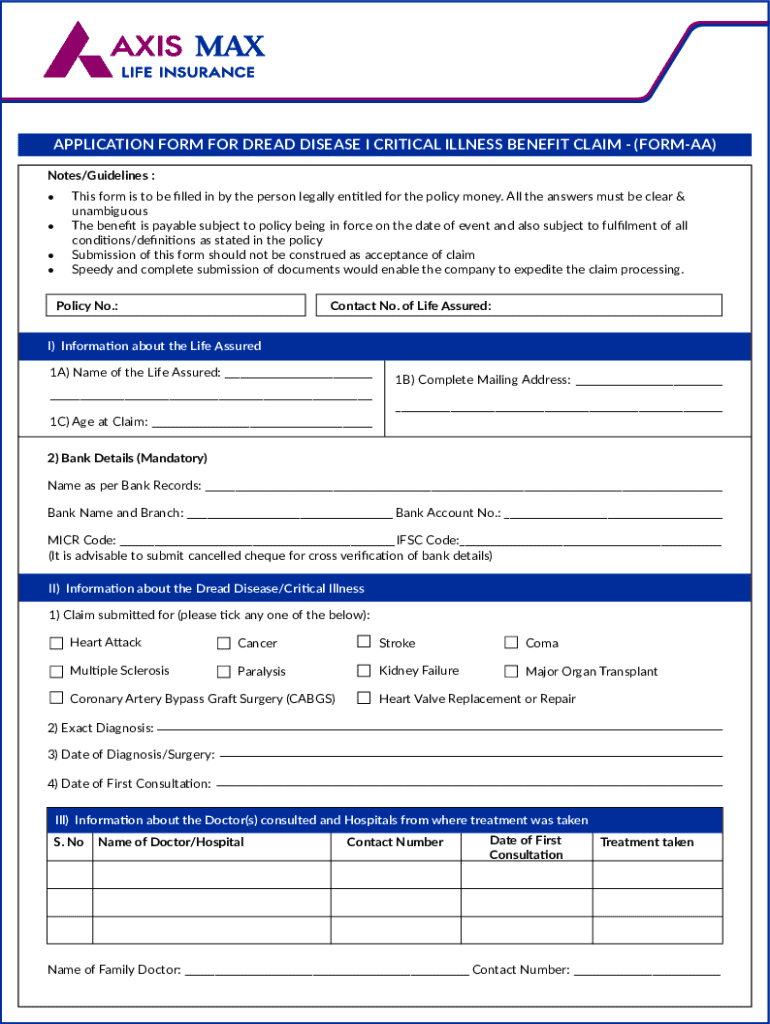 Get the free Application Form for Dread Disease I Critical Illness Benefit Claim - (form-aa)