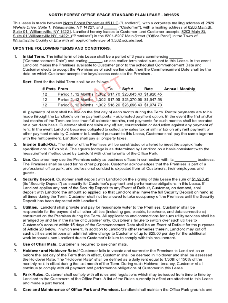 The North Forest office space form is thoughtfully designed, containing multiple sections vital for effective lease documentation. Key features include: