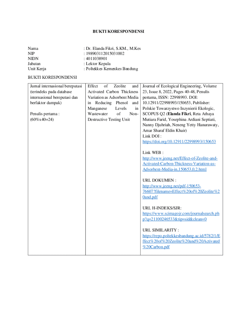 Dokumen ini berisi bukti korespondensi dan penelitian tentang pengaruh variasi ketebalan zeolit dan karbon aktif sebagai media adsorben dalam mengurangi tingkat fenol dan mangan pada limbah air dari