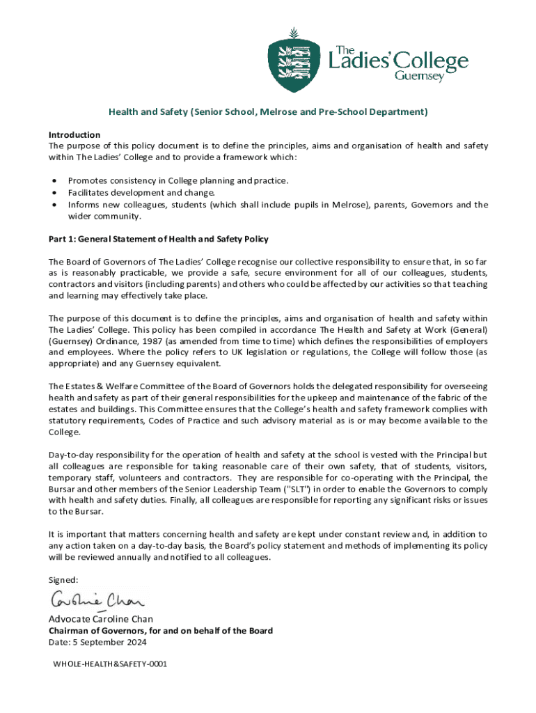 Get the free Health and Safety (senior School, Melrose and Pre-school Department)