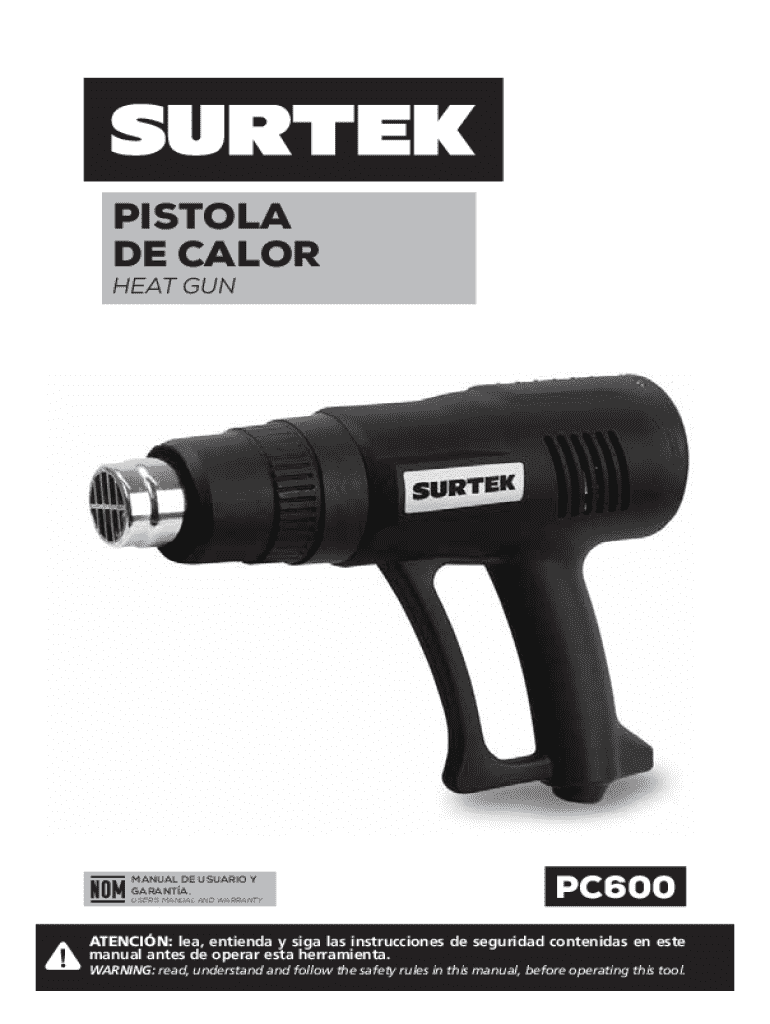 Este documento contiene el manual de usuario y la garantía para la pistola de calor PC600, incluyendo instrucciones de seguridad, características, y procedimientos de operación.
