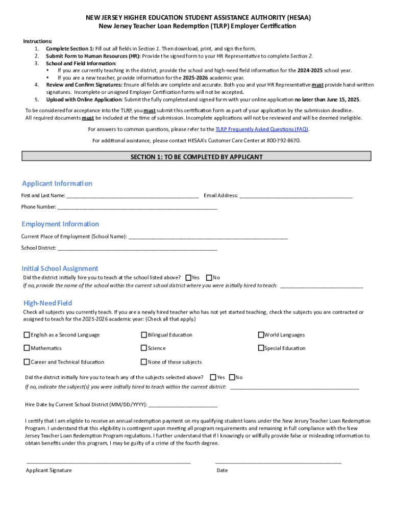 Get the free New Jersey Teacher Loan Redemption (tlrp) Employer Certification