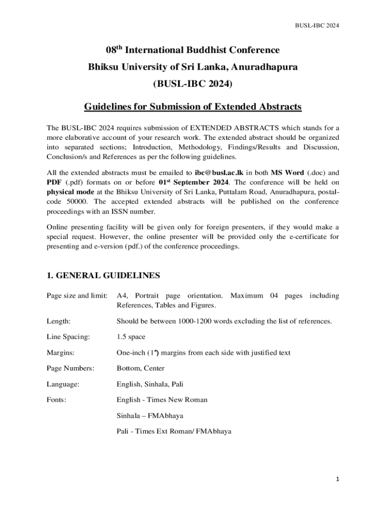 This document outlines the guidelines for submitting extended abstracts for the 08th International Buddhist Conference 2024, including requirements for format, structure, and submission procedures.