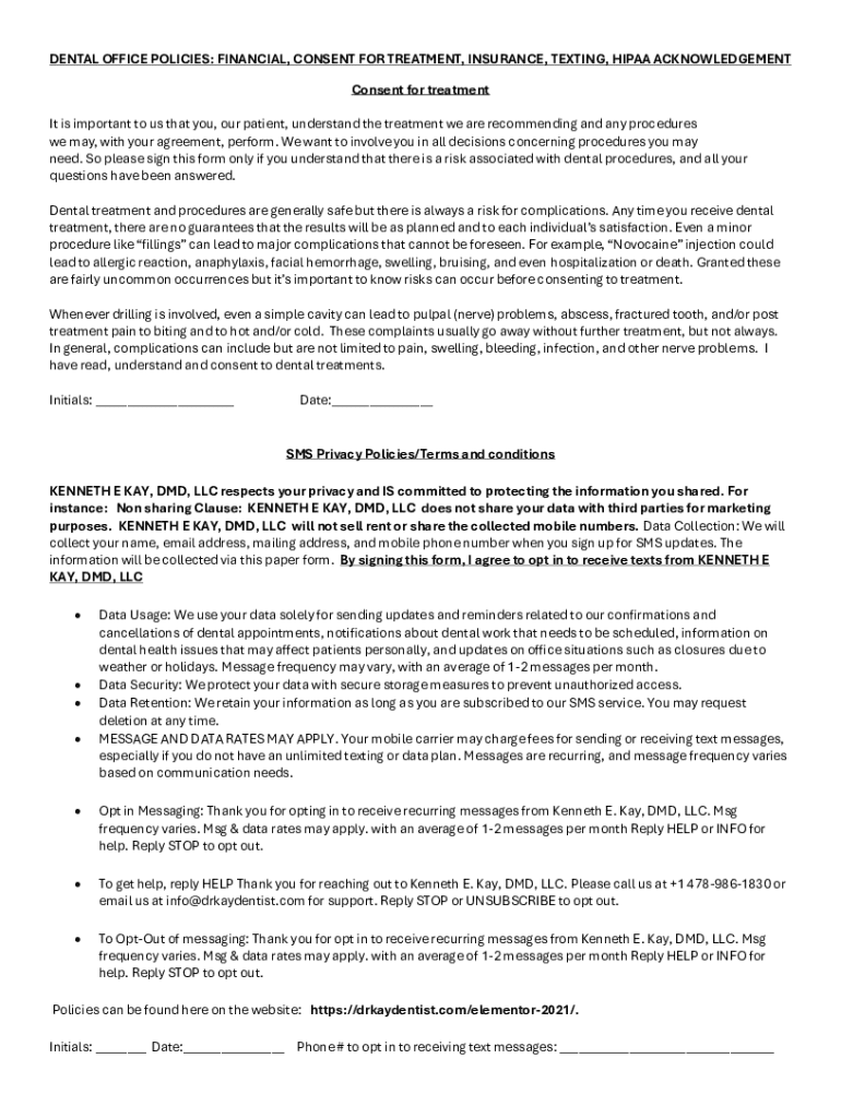 This document outlines the dental office\'s policies regarding consent for treatment, financial obligations, insurance billing, text messaging privacy, and HIPAA privacy practices.