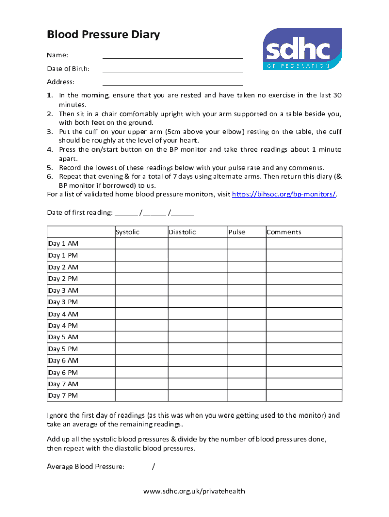 A blood pressure diary form is a structured record-keeping tool used by individuals to document their blood pressure readings over time. The primary purpose of this diary is to promote consistency in monitoring one's blood pressure, which can highlight significant trends that may need attention from healthcare professionals.