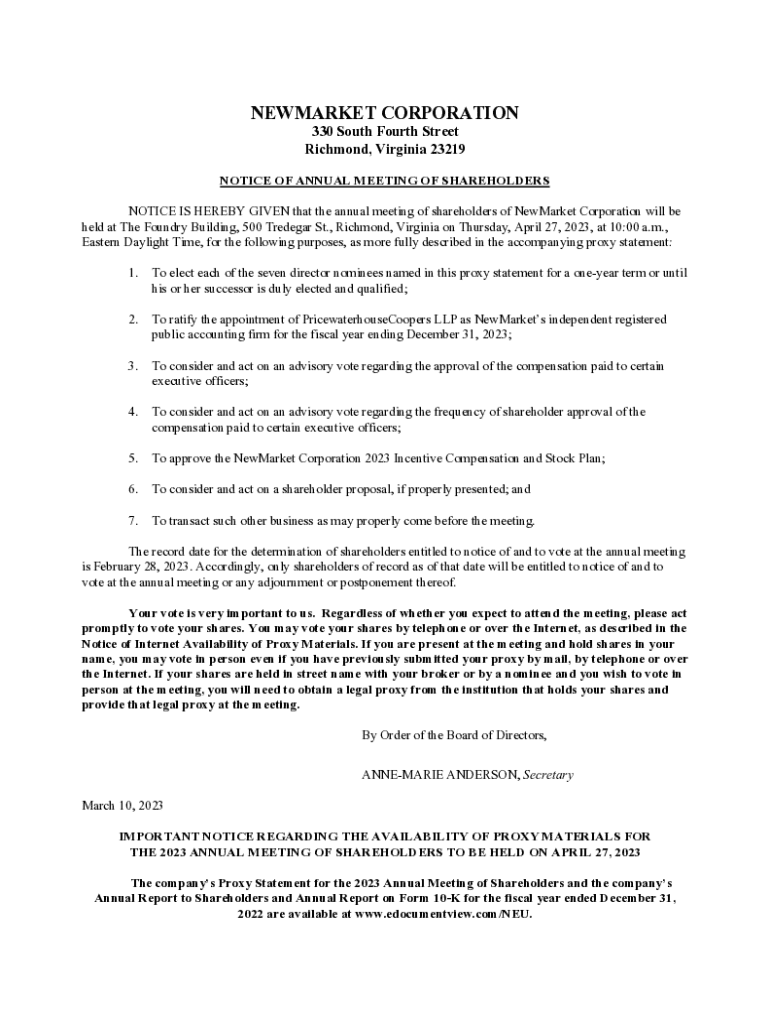 This document provides notice of the annual meeting of shareholders for NewMarket Corporation, detailing the date, time, location, and agenda for the meeting. It also includes information regarding