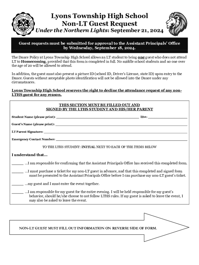 The Non-LT Guest Request Form serves as an essential document for students wishing to invite guests to events, especially in educational environments. This form not only provides a structured way to gather necessary information but also ensures compliance with institutional regulations. Its primary purpose is to create a transparent process for guest attendance, enabling secure and organized interactions within the campus environment.