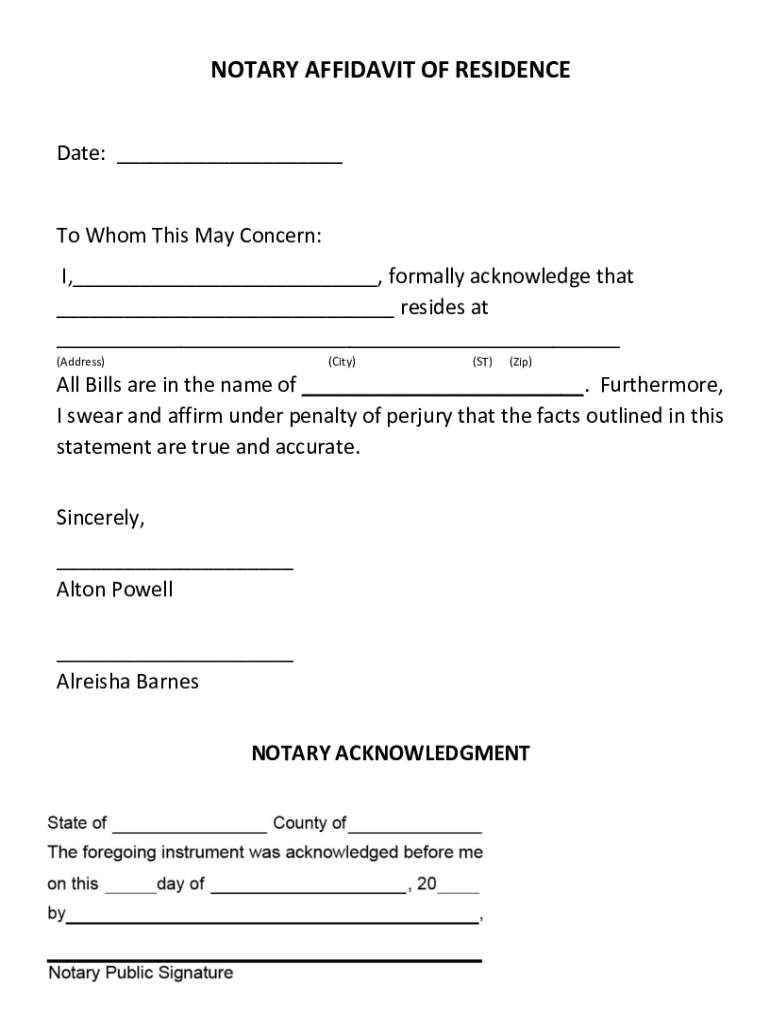 The notary affidavit of residence serves as a formal declaration by an individual attesting to their current living address. This legal document typically requires the signature of a notary public, who verifies the identity of the affiant and ensures the affidavit is executed correctly. The importance of having a notarized affidavit cannot be overstated, as it lends credibility and authenticity to the assertions made within it.