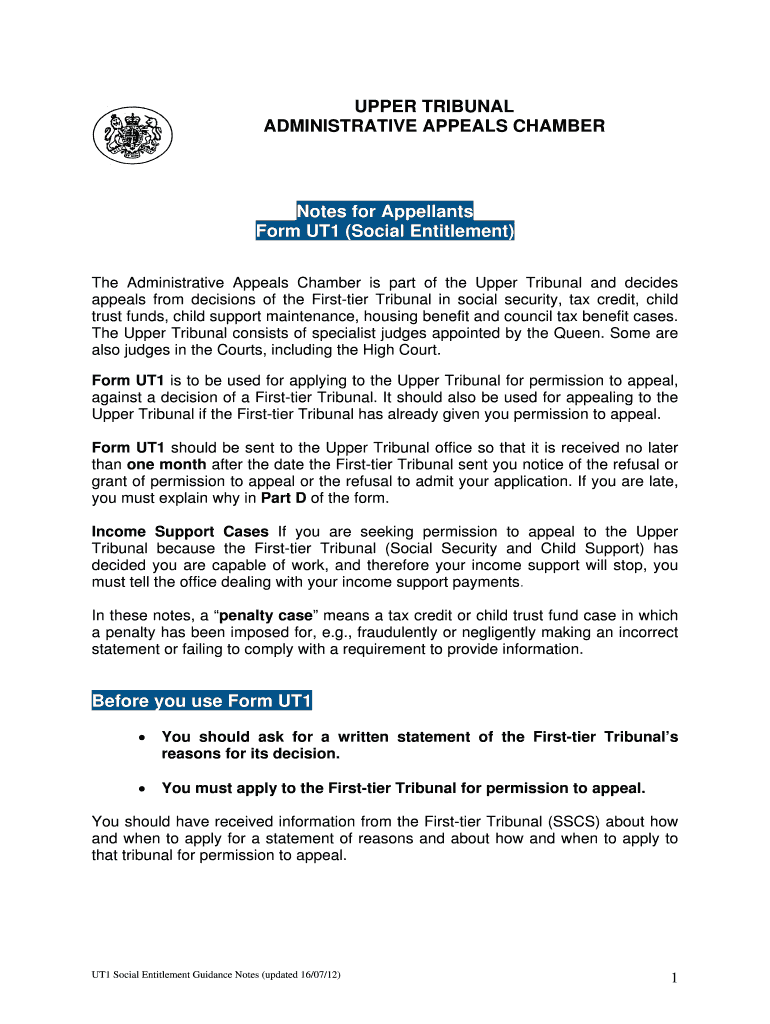 UPPER TRIBUNAL ADMINISTRATIVE APPEALS CHAMBER Notes for Appellants Form UT1 (Social Entitlement) The Administrative Appeals Chamber is part of the Upper Tribunal and decides appeals from decisions
