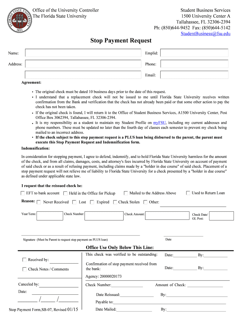 Office of the University Controller The Florida State University Stop Payment Request Student Business Services 1500 University Center A Tallahassee, FL 32306-2394 pH: (850)644-9452 Fax: (850)644-5142