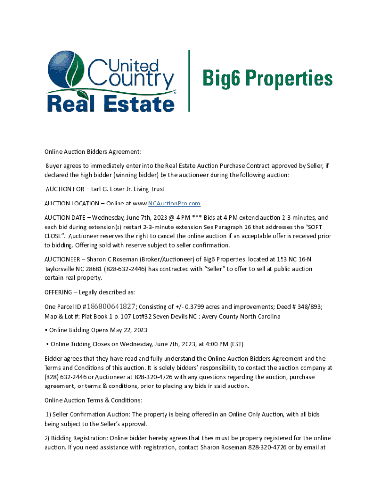 This document serves as a registration form for brokers and bidders participating in the online auction for the property located at 324 Buckeye Lane, Seven Devils, NC. It outlines the registration