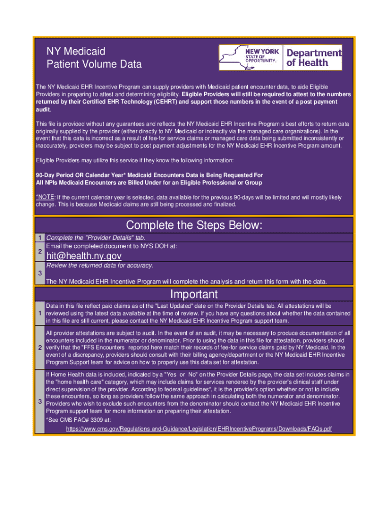 Understanding the components of the NY Medicaid Patient Volume Form is crucial for accurate completion. The form primarily revolves around patient volume calculation, which defines the number of patients eligible for Medicaid services. This section requires careful documentation of patient records and financial statements.